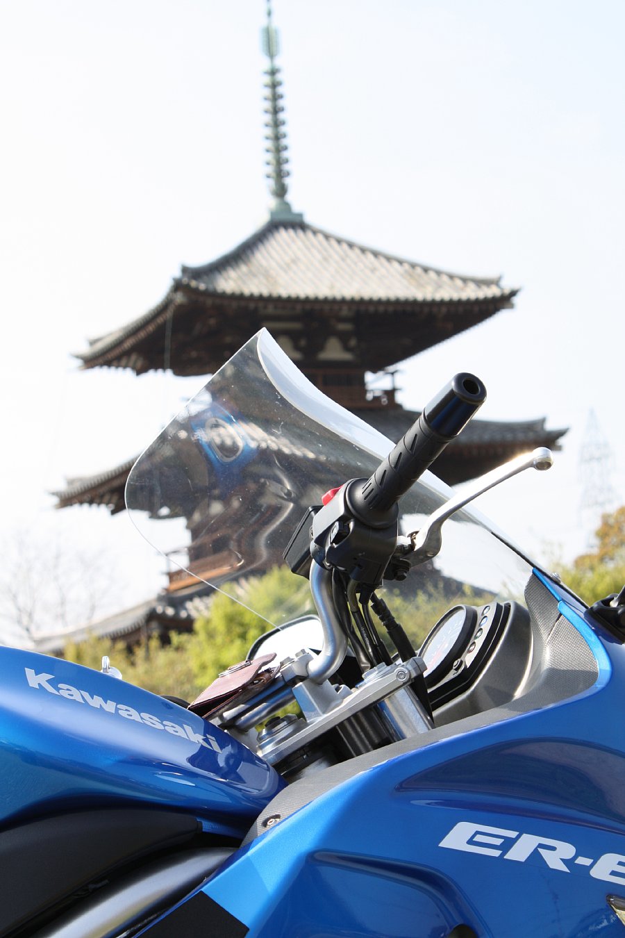 Rep.16 ER-6f奈良行 23:57 2009/05/31記 4月21日、原稿が煮詰まったので奈良へ一泊プチツーに行きました。 ER-6f好きの方のために、あまり解説は入れずにやります。 一宮市から木曽川沿いにくだり、北から奈良へ入って南から抜けてくると言うルート。 伊賀上野の山の中で桜がいい感じ。 これはもう奈良。 実は東大寺、生まれて初めてでした。 最近、大建築好き、歴史好きになりつつあるので、このスケールにほほーと感心。 観光客のくれる大量のせんべいに埋もれた鹿。 いつかきっとせんべい死するに違いない。 これは法華寺。このあと法隆寺にも行きました。やはり初めて。 法隆寺そのものはよかったんだけど、革のライディングブーツのみで行ったのは失敗でした。 歩くための靴も持参するべきだった。 法隆寺犬。 帰りの木曽川で目撃した野生の雉。 650に乗っといてこんなことを言うのもなんですが、高速はやっぱり疲れます。 このバイクは下道を走るぐらいが快適でした。 (文責:小川一水) |